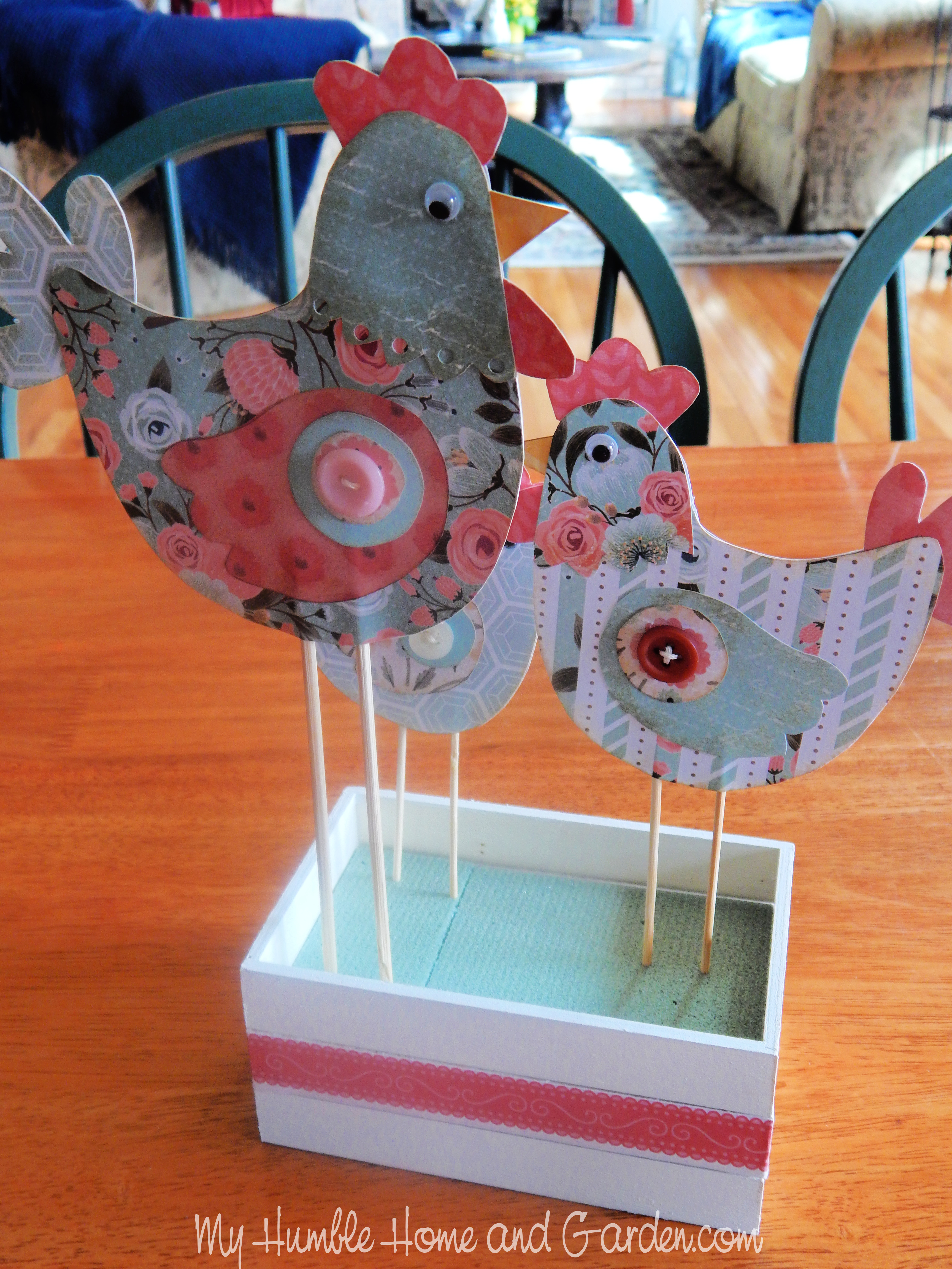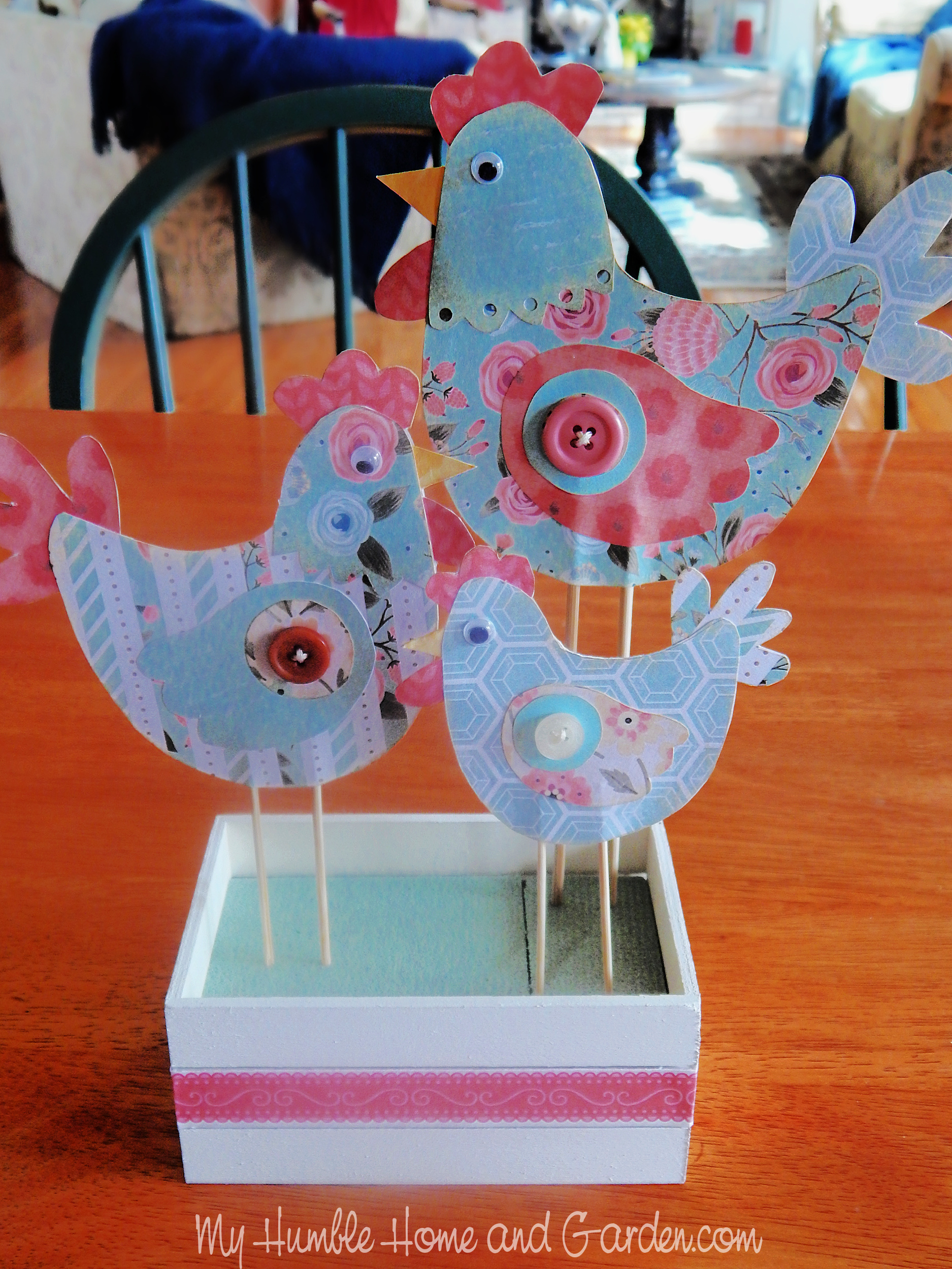 A Pinterest pin inspired this easy-to-make Easter chicken craft. Instead of individual hens made from wood, I’ve created three paper hens in a wooden crate. Here’s how to make this spring chicken centerpiece.