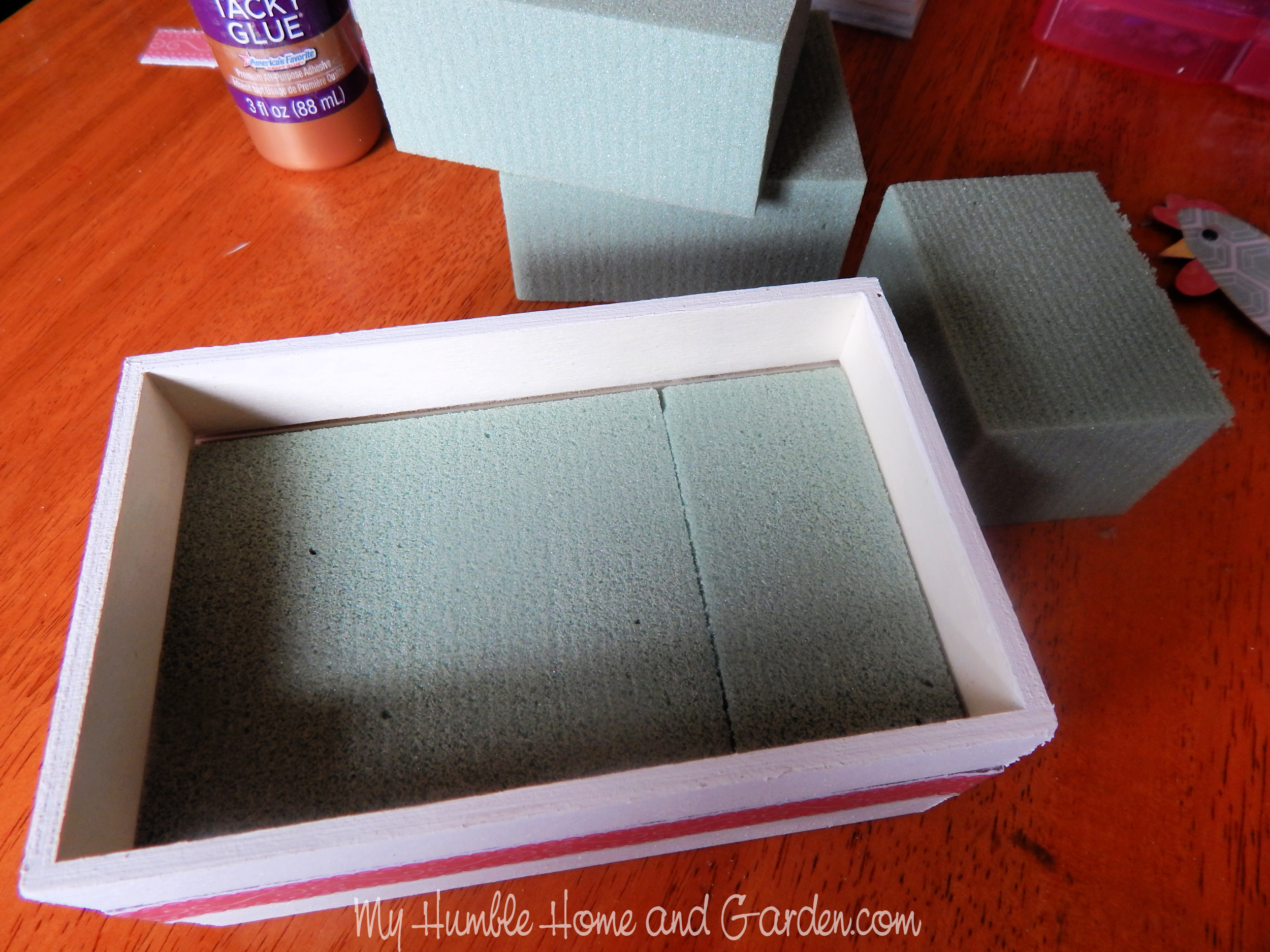 Dollar Tree has a package of flower foam with 4 pieces. It is the perfect size for this little crate. I measured, marked, and cut the end off one. The two fit perfectly. You only need one simple cut.