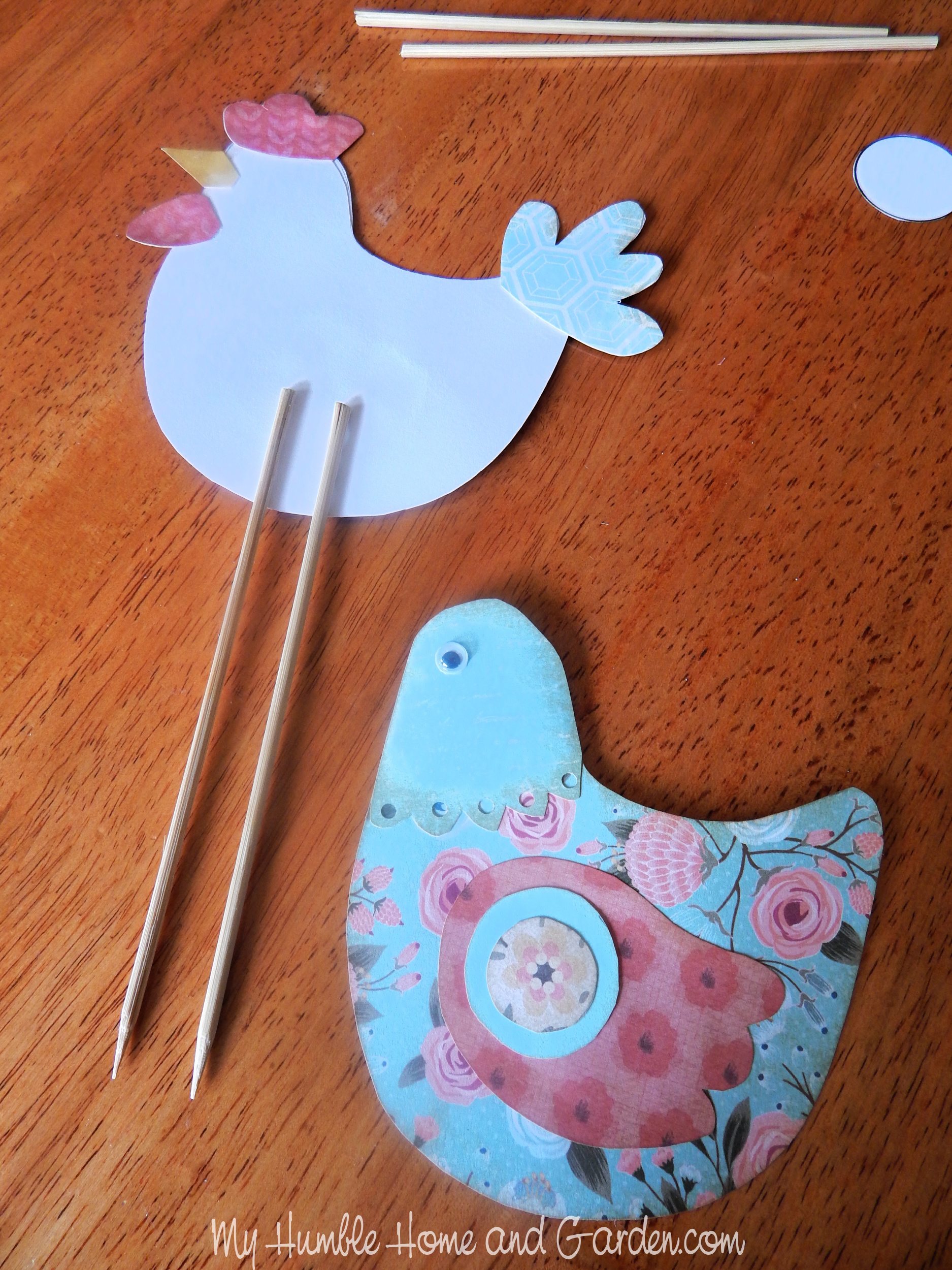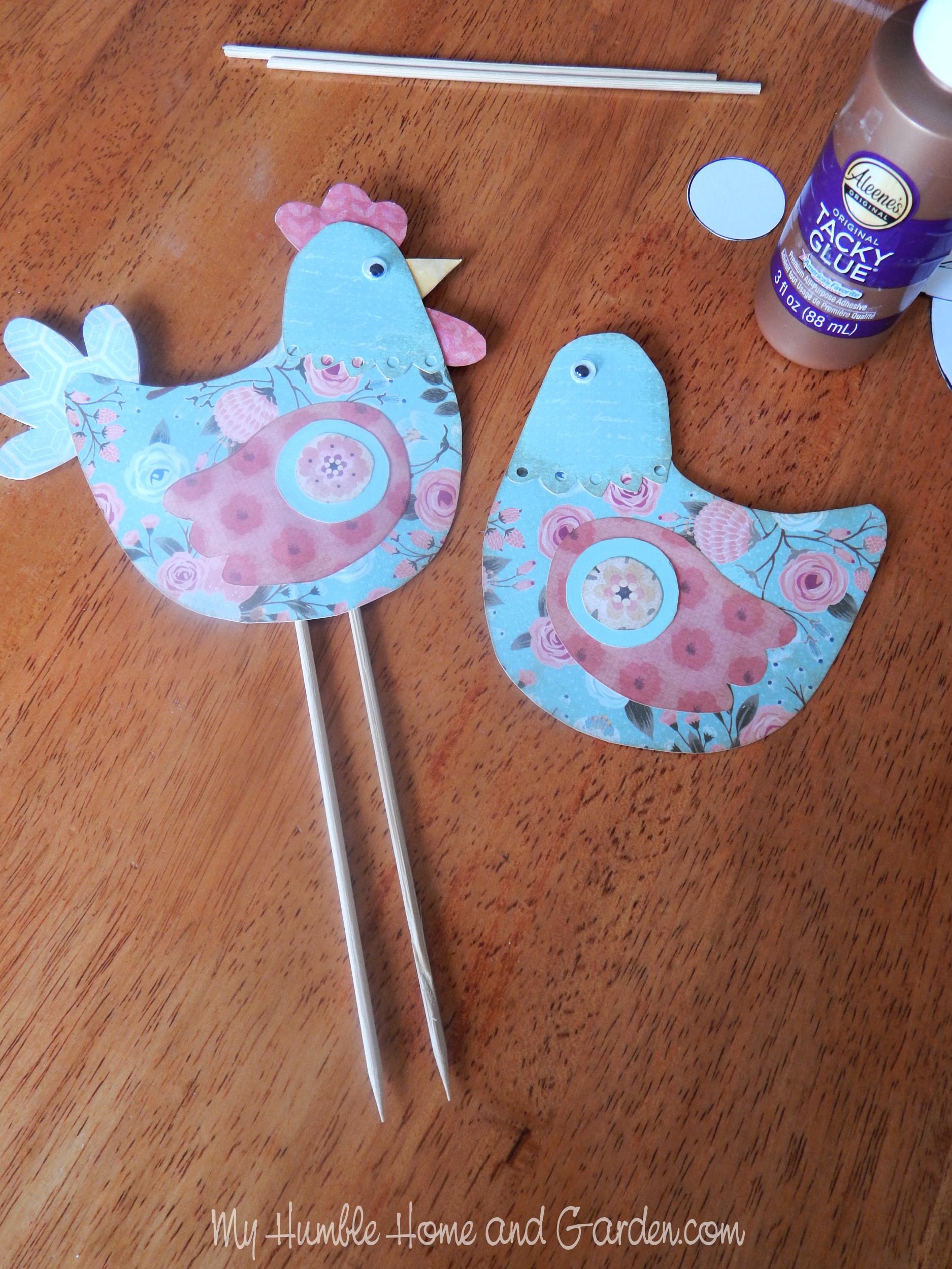 Use Tacky Glue to adhere the pieces and googly eyes to the chicken body. The skewers we have on hand are 12 inches long. I cut them 6 inches long. The picks for the other two hens are 4 inches in length. We want them to be at different heights in the crate.