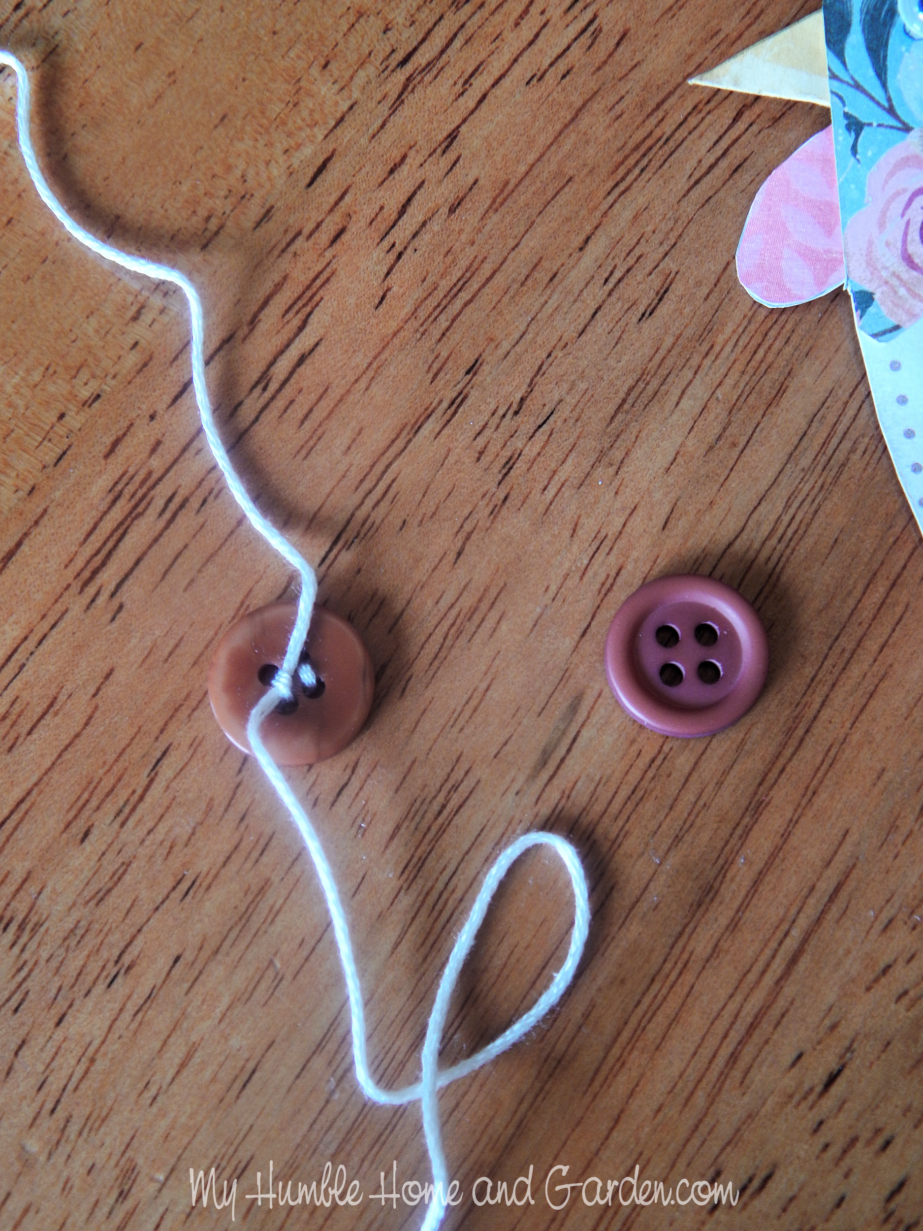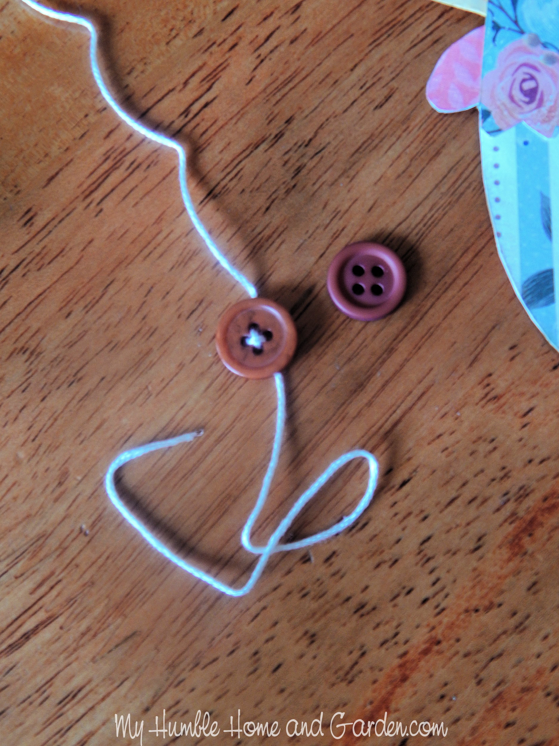 You can easily thread embroidery floss through the buttonholes to create a little interest. There’s no need to get a needle. Just squeeze a little Tacky Glue onto the end, twirl it between your thumb and forefinger. Then let it dry for a minute. It will be easy to thread it into the holes.
