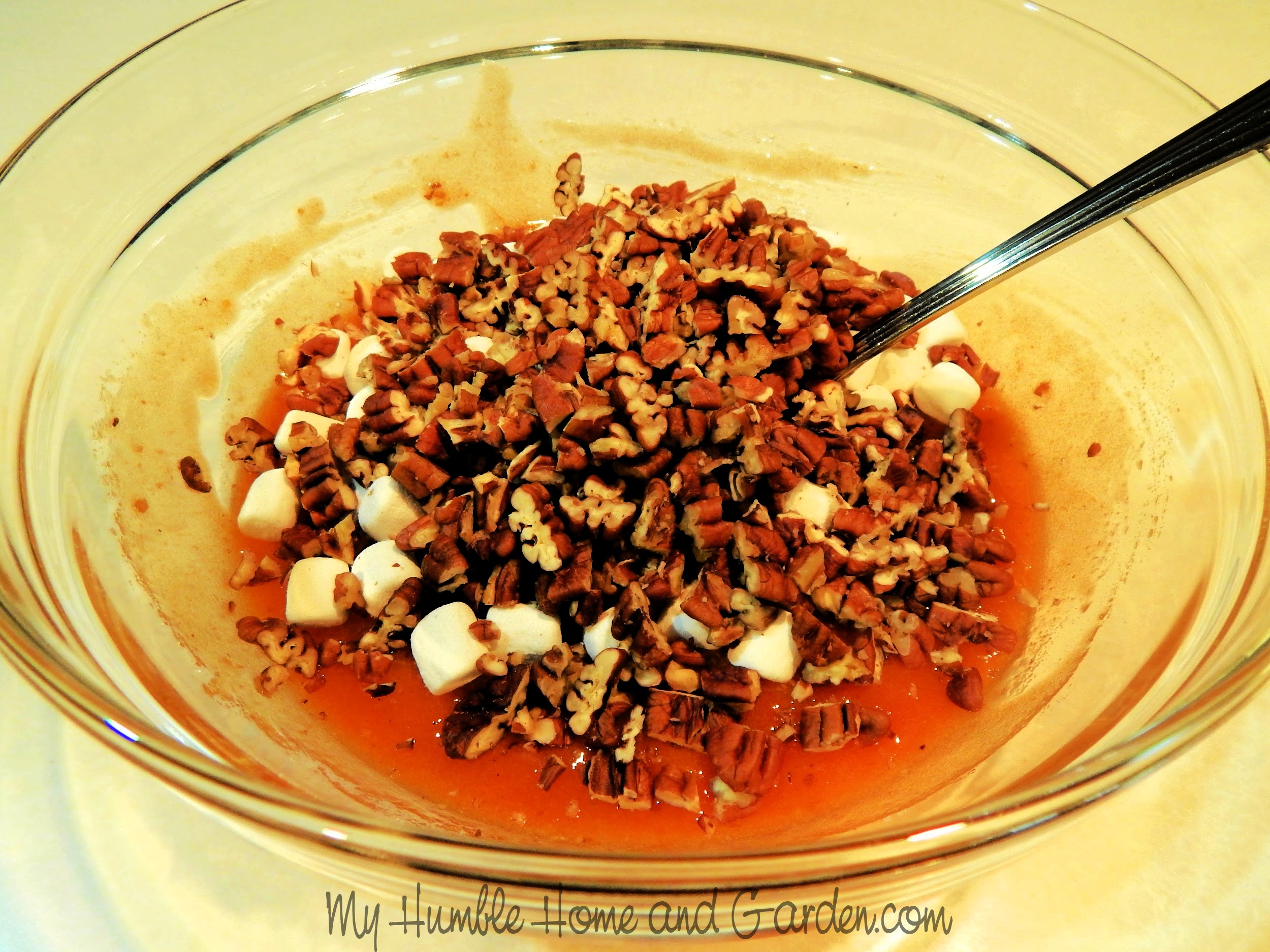 Stir sugar into pulp. Add chopped nuts and marshmallows. Then add crushed crackers, a bag at a time. It takes a little effort to combine the last of the crumbs into the mixture. (It’s okay to use your hands!)